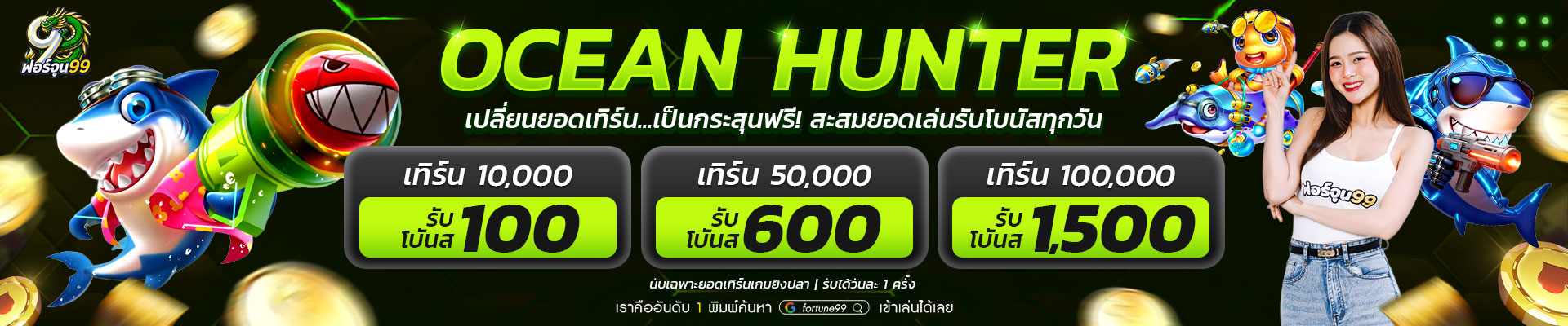 สำหรับผู้ที่ชื่นชอบเกมยิงปลา เรามี Fish Hunter ที่มีอัตราจ่ายรางวัลตั้งแต่ x2 ถึง x1,000 เท่า ขึ้นอยู่กับชนิดของปลาที่ยิงได้ โดยปลาบอสพิเศษจะให้รางวัลสูงสุด